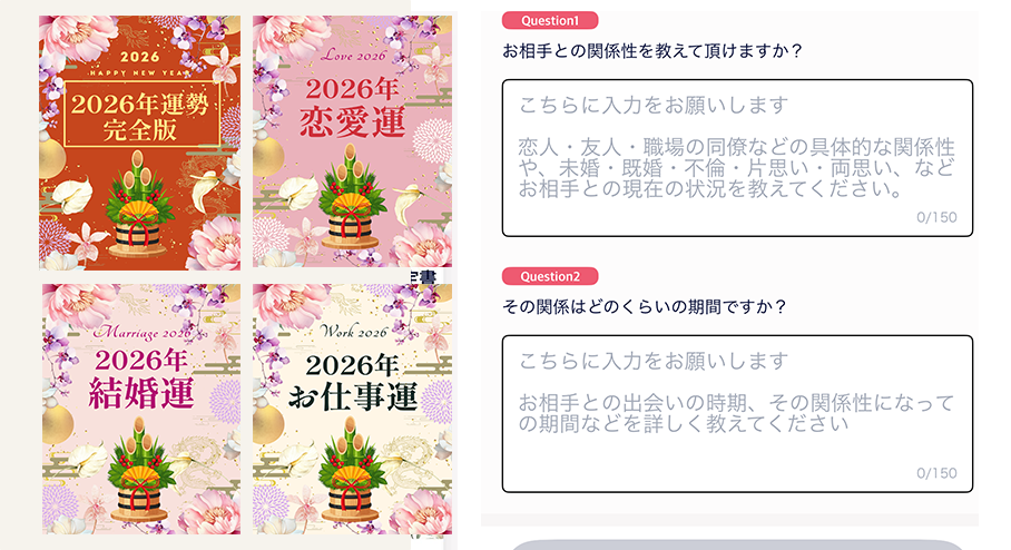総合版はもちろん、恋愛だけ・仕事だけなど、欲しい情報だけピンポイントで選択可能。無駄なく、自分に必要な“来年の答え”を受け取れます。