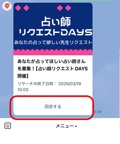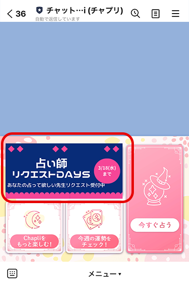 トーク画面のリッチメニューにあるバナーをタップしてください。